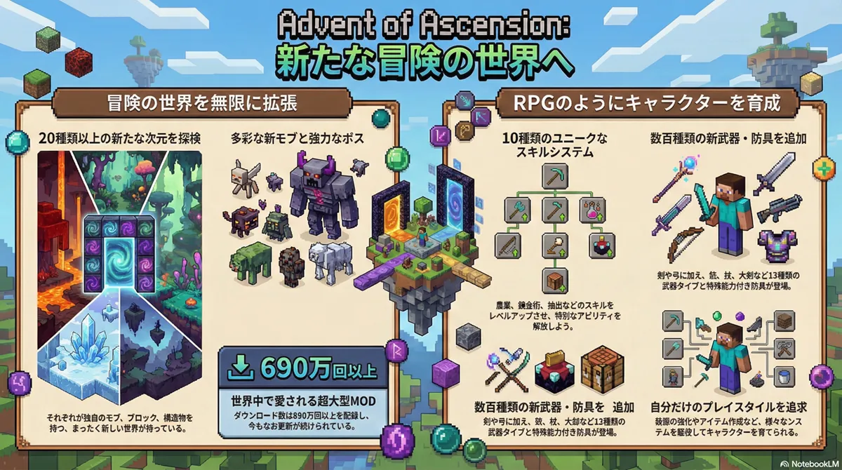 多数の異世界や数百種類のモンスター、装備に加え、独自のスキル・資源システムを導入することで、Minecraftに膨大なRPG要素と冒険を追加するオールインワン型の大型MOD『Advent of Ascension (Nevermine)』の解説と日本語化リソースパック配布を行っています。