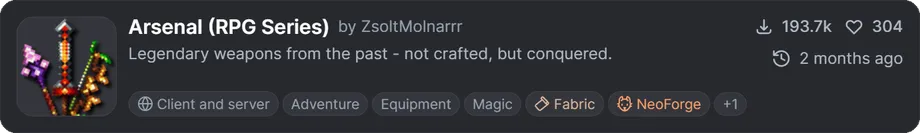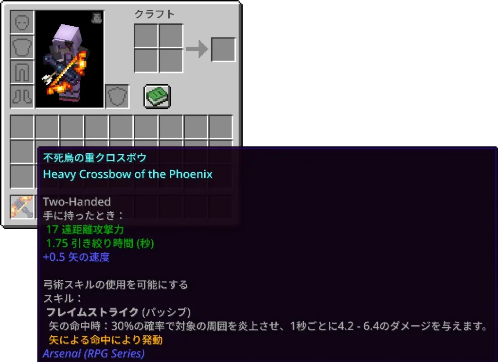 『Arsenal (RPG Series)』は、クラフト不可能な武器群を多数追加する武器拡張MODです。