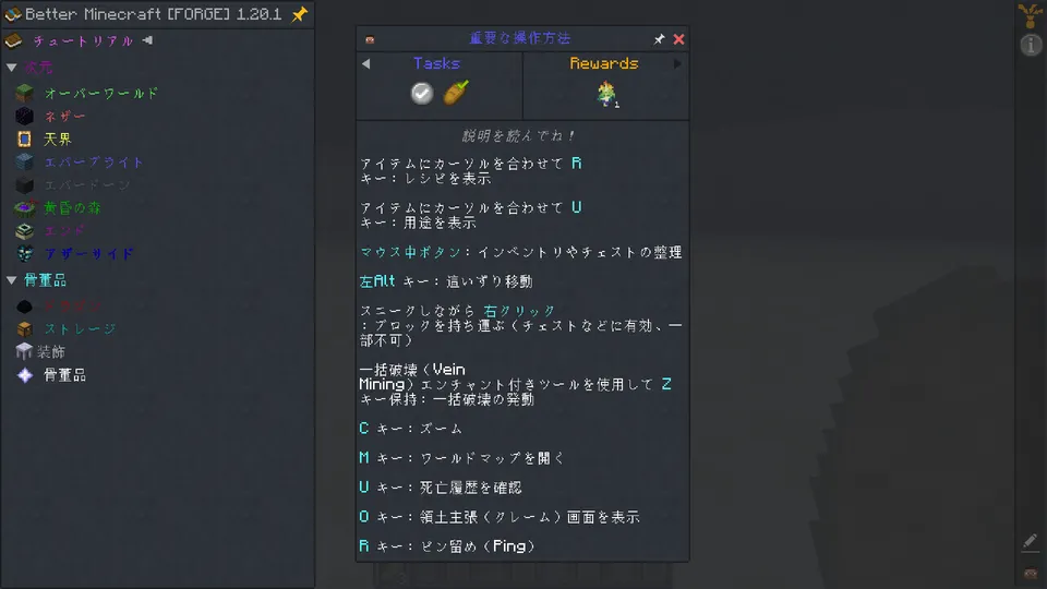 Better MCには多くの便利なキー操作が追加されていますが、まずは以下の5つを覚えれば、探索から素材集めまで、あらゆる場面でゲームプレイが快適になります。