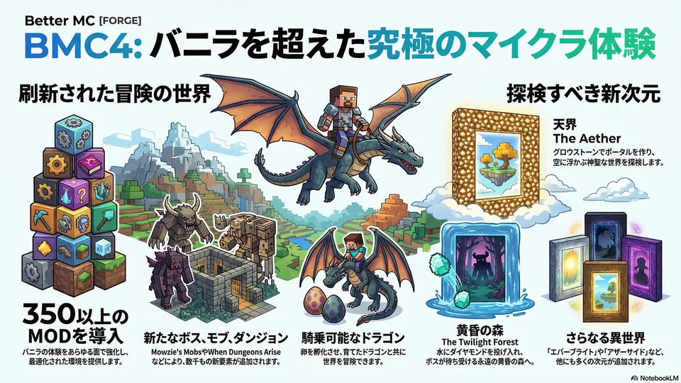 マインクラフトのバニラ体験を究極に拡張した人気MODパック『Better MC [FORGE] BMC4』の解説とクエストを日本語化する日本語化リソースパックを配布しています。