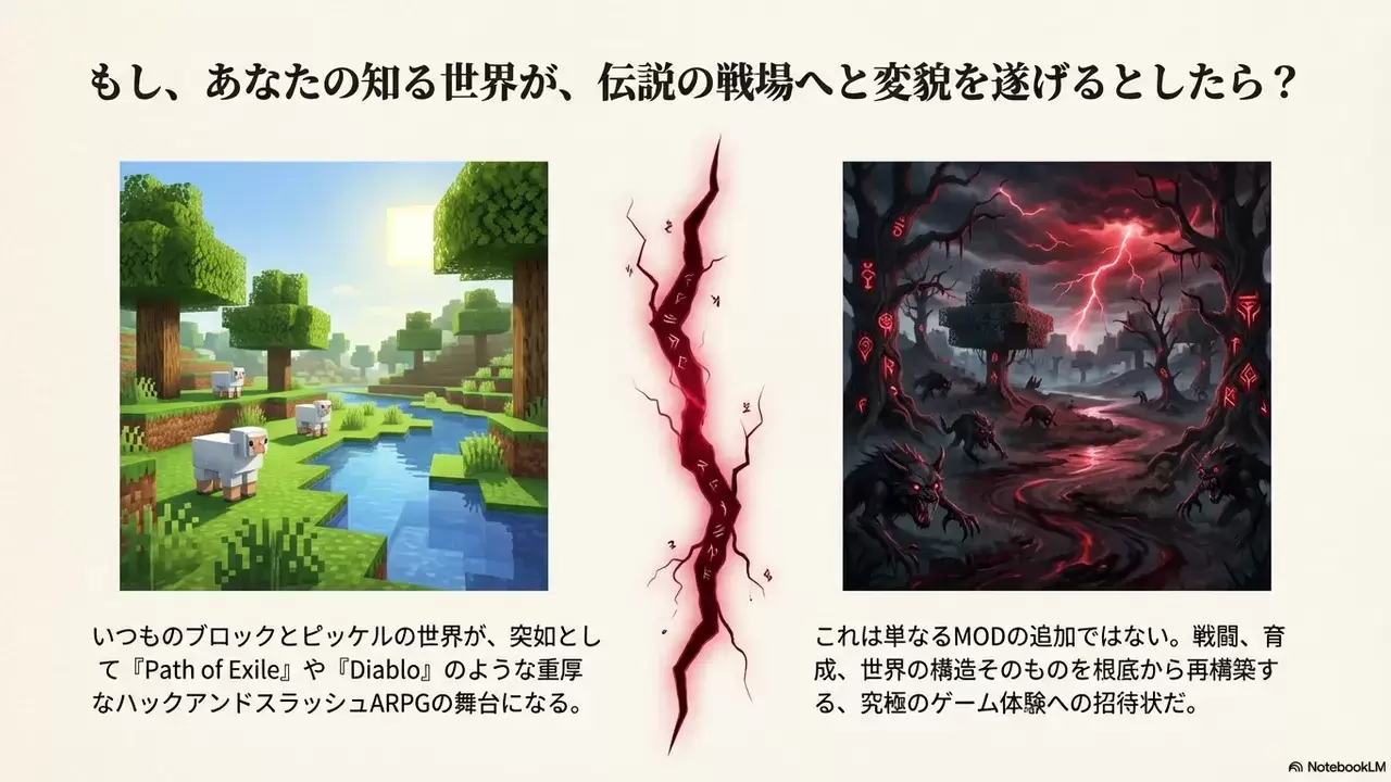 いつものブロック世界が突如として『Path of Exile』や『Diablo』のような重厚なハックアンドスラッシュ(ハクスラ)系アクションRPG(ARPG)の戦場へと変貌を遂げる—。