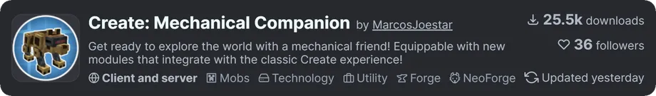 • 召喚方法: 「メカニカルウルフリンク」というアイテムを作成し、Curios(装備スロット拡張MOD)の頭スロットに装備することで召喚されます。