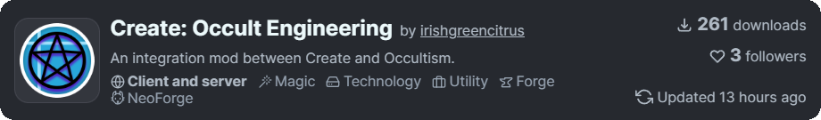 OccultismとCreateを統合する『Create: Occult Engineering』の紹介と日本語化リソースパックを配布しています。