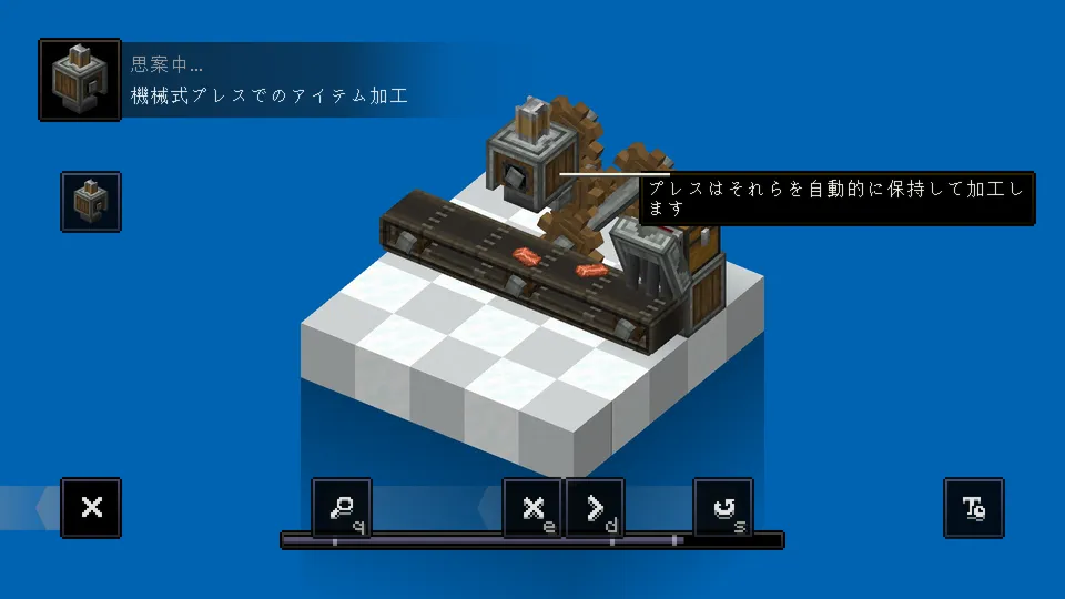 - プレス: 機械式プレスでインゴットを板状に加工したり、アイテムを圧縮します。