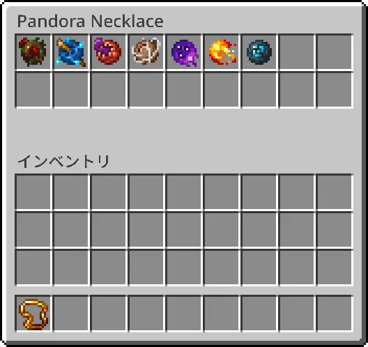 これらはアイテム自体がインベントリ(入れ物)となっており、手に持って右クリックで中に「チャーム」を入れることができ。そうすることにより効果を発揮します。
