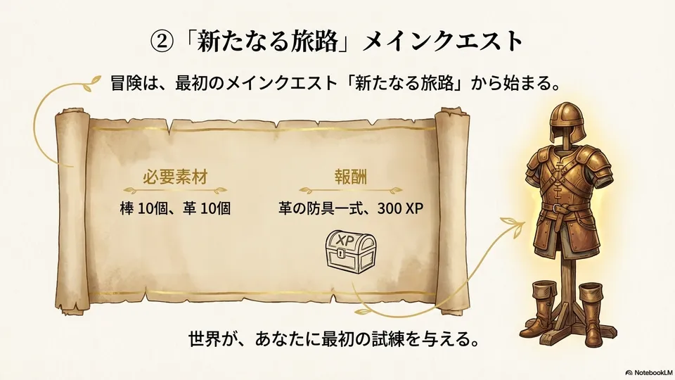 物語は、あなたの意識が覚醒するその瞬間から始まる。ここはあなたの知る世界ではない。土の下にはいにしえの魔術が眠り、風はまだ見ぬ冒険の到来を囁いている。この世界でいかに生き、何を成すかは、すべてあなたの選択に委ねられている。そして、その最初の一歩を記す試練が、最初のクエスト「新たなる旅路」として、静かにあなたを待っているのだ。