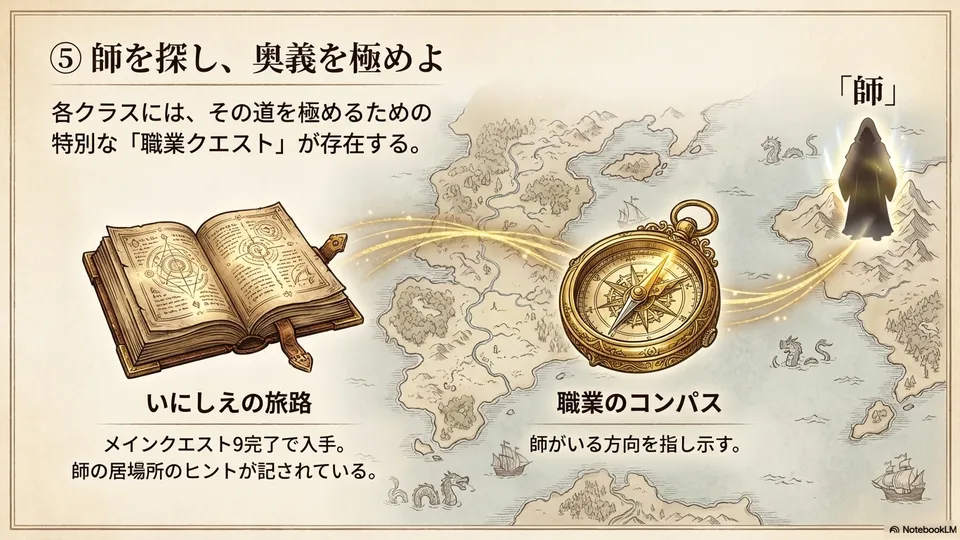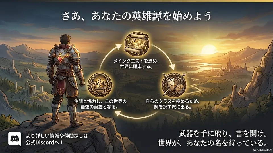 九つの試練を乗り越え、次元への扉を開いた英雄は、その功績の証として古書「いにしえの旅路」を授かる。そのページには、自らが選んだ職業の道を極めるため、伝説の師が待つ場所の座標が記されていた。世界の果てを目指す傍ら、英雄は書を手に、己の魂を磨くための新たな旅路へと出発する。