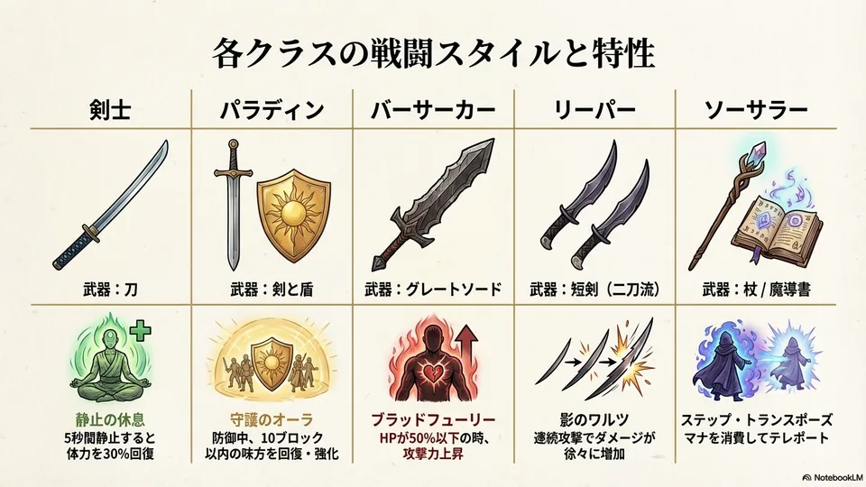 プレイヤーは5つのクラスから1つを選び、それぞれ独自の戦闘スタイルを楽しむことができます。