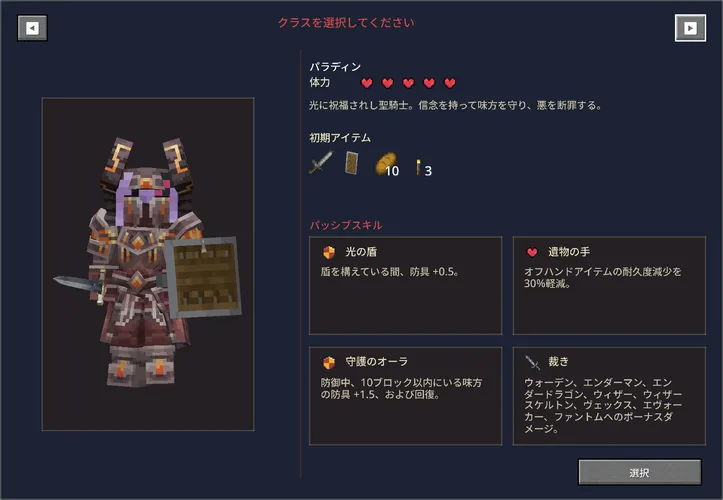 • パラディン (Paladin): 盾と剣を手に、信念を持って味方を守り悪を断罪する聖騎士。