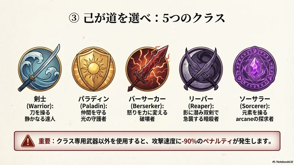 • ソーサラー (Sorcerer): 杖や魔導書を操り、元素を意のままに操る秘術の探求者。 注意: クラスに適さない武器を使用すると、攻撃速度に-90%(または-70%)の甚大なペナルティが課せられます。武器選びは慎重に行いましょう。