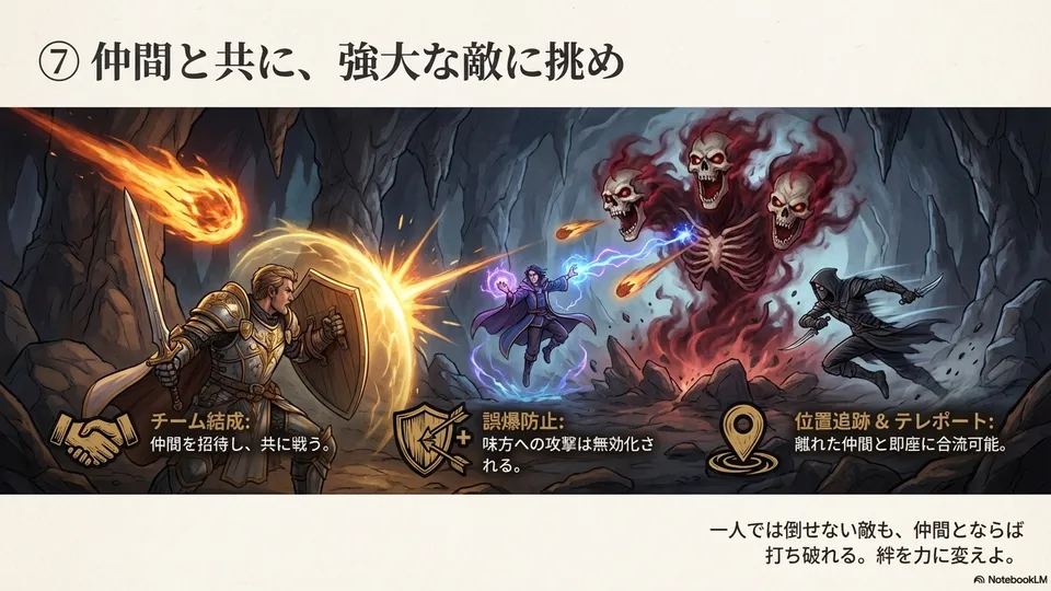 友人とチームを組み、位置の追跡やテレポート(エンダーアイを消費)が可能です。パーティー内ではPvPダメージが無効化されるため、安心して共闘できます。