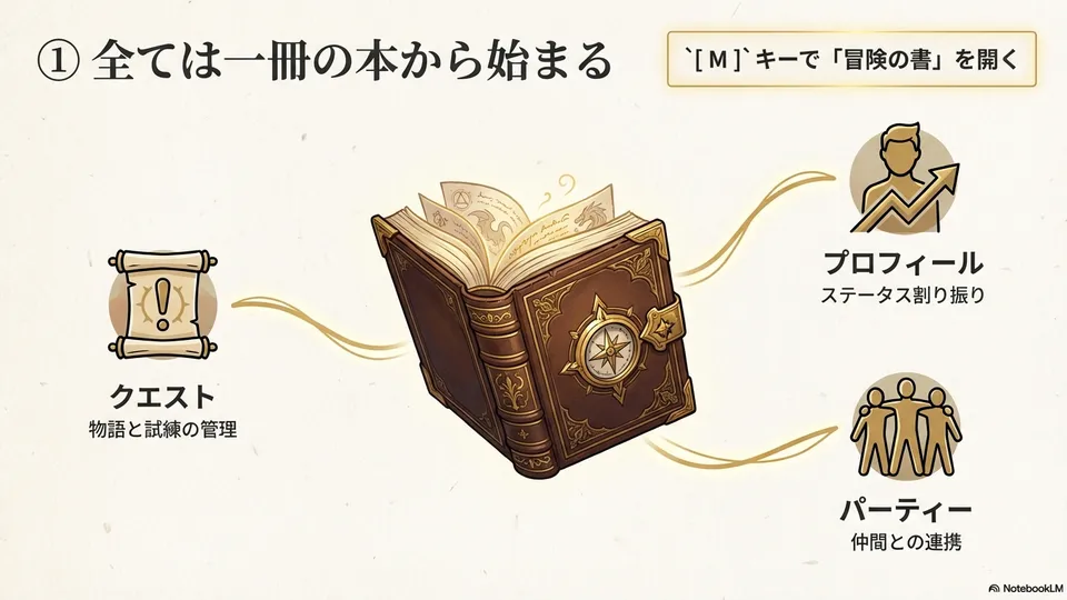 煩雑なメニューを排除し、すべてのクエスト管理、ステータス割り振り、パーティー編成などは一冊の「ブックUI」で完結します。