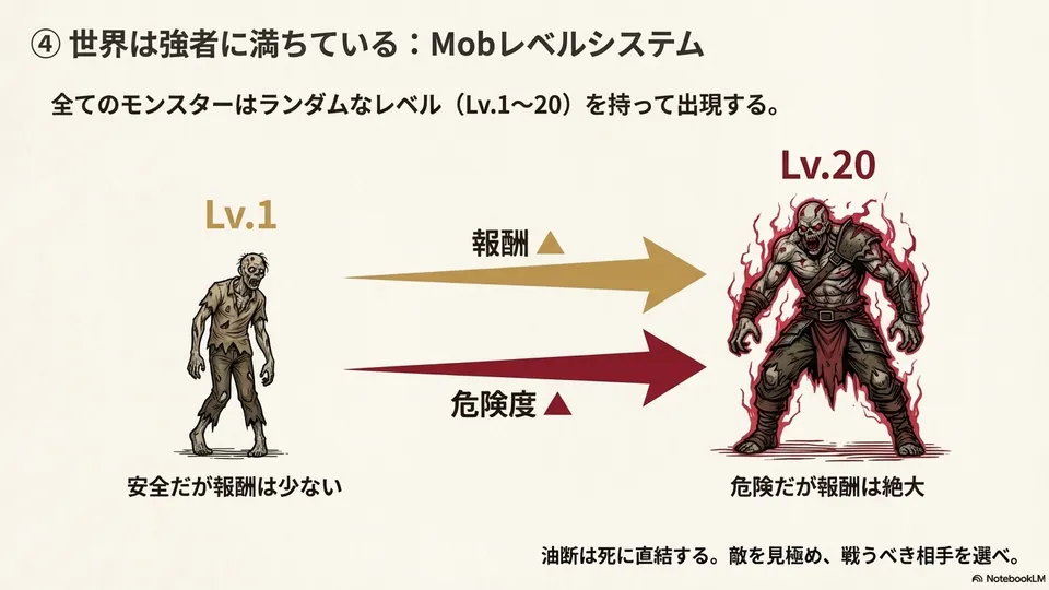 すべてのモンスターにはLv.1~20のランダムなレベルが設定されます。レベルが高いほど体力と攻撃力が上昇しますが、その分レアアイテムのドロップ率や獲得経験値も大幅にアップします。