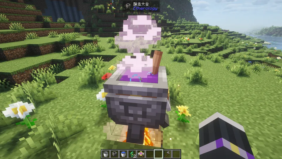 - 醸造大釜 (Brewing Cauldron): 水を入れ、焚き火などで加熱して使用します。相を持つアイテムを投げ入れ、右クリックでかき混ぜることで、「エボニーのインゴット」などの特殊な素材を作ることができます。