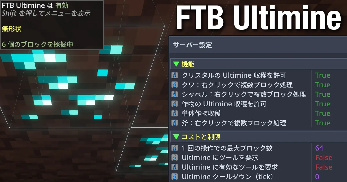 FTB Ultimineは、Minecraftにおいて複数のブロックを一度に効率的に採掘できる機能を提供するMODです。