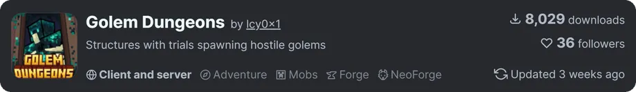 敵対的なゴーレムの試練構造物を追加する『Golem Dungeons』の紹介と日本語化リソースパックを配布しています。