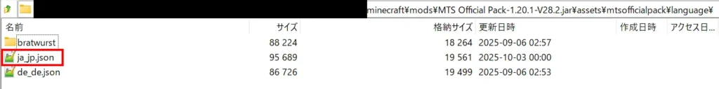 開いたら別ウィンドウが開くので、assets→mtsofficialpack※この部分はMODで変わる→languageの順でフォルダを移動。