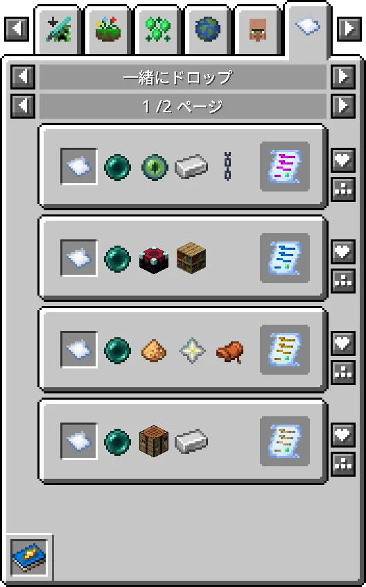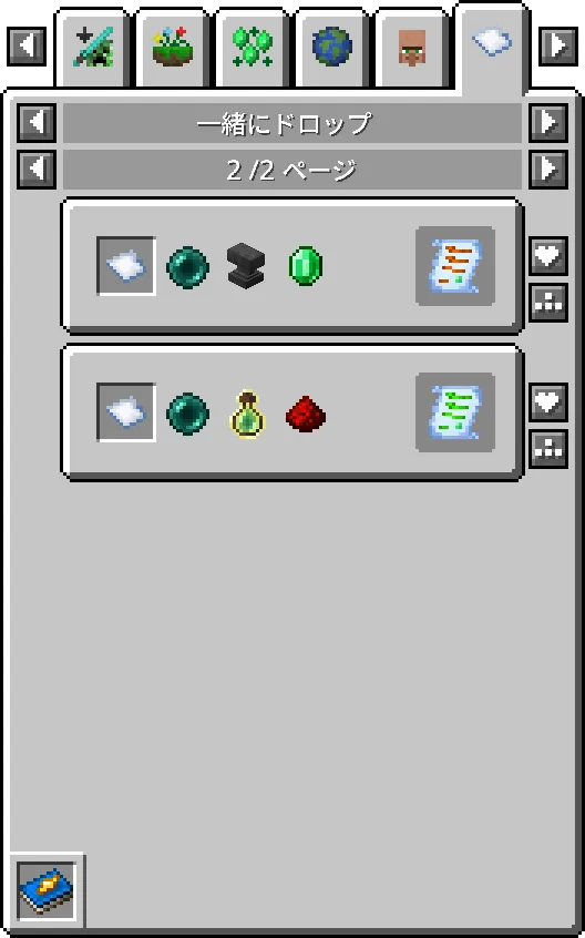 | 商売人 | 村人との取引価格を下げ、安く取引できるようになります。 | 司書から襲撃後に贈られる |