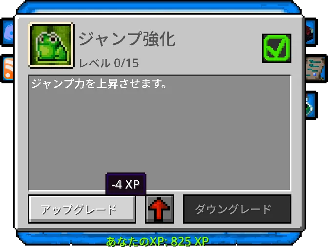 | ジャンプ強化 | ジャンプ力を上昇させます。 | 初期スキル |
