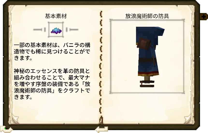 | 魔導士の防具 | 10種類以上の防具セットが追加される。 放浪魔術師の防具などの序盤用から、各魔法系統に対応した終盤用防具まで存在し、特定系統の魔法を強化する効果を持つ。 |