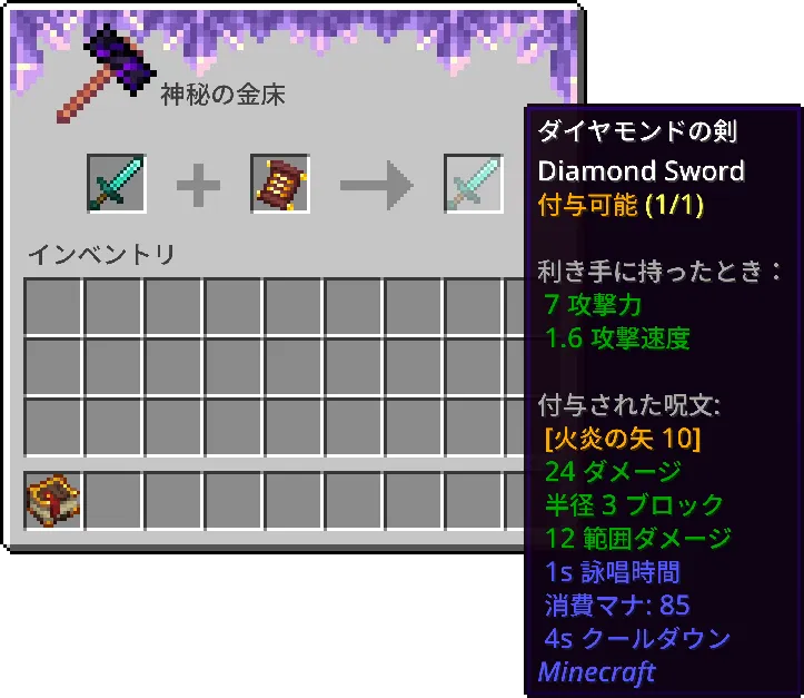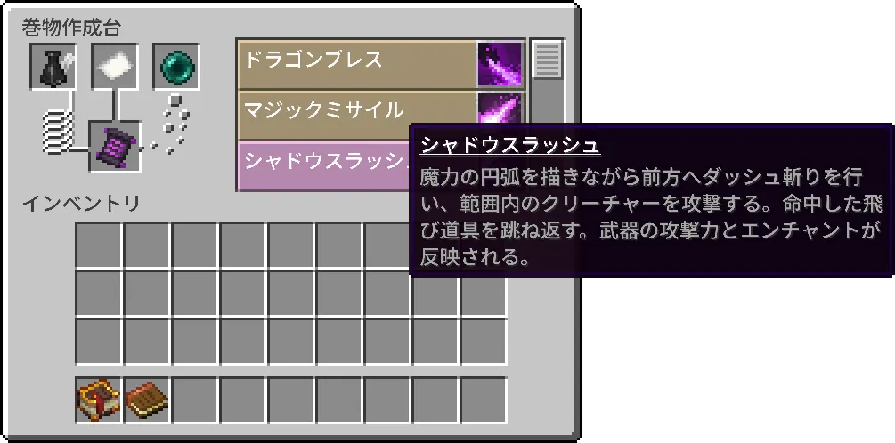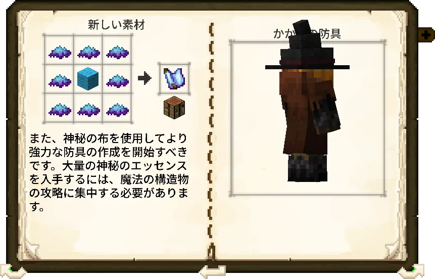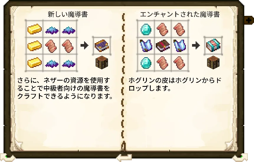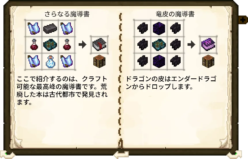 - 最高峰の魔導書:ネザライトの魔導書(古代都市の「荒廃した本」を使用)や、竜皮の魔導書(エンダードラゴンの「ドラゴンの皮」を使用)を作成し、呪文スロットを最大まで拡張しましょう。