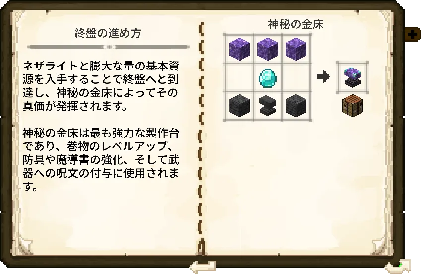 終盤の進行は、神秘の金床を中心に回ります。これは本MODで最も強力な製作台であり、以下の3つの重要な役割を担います。