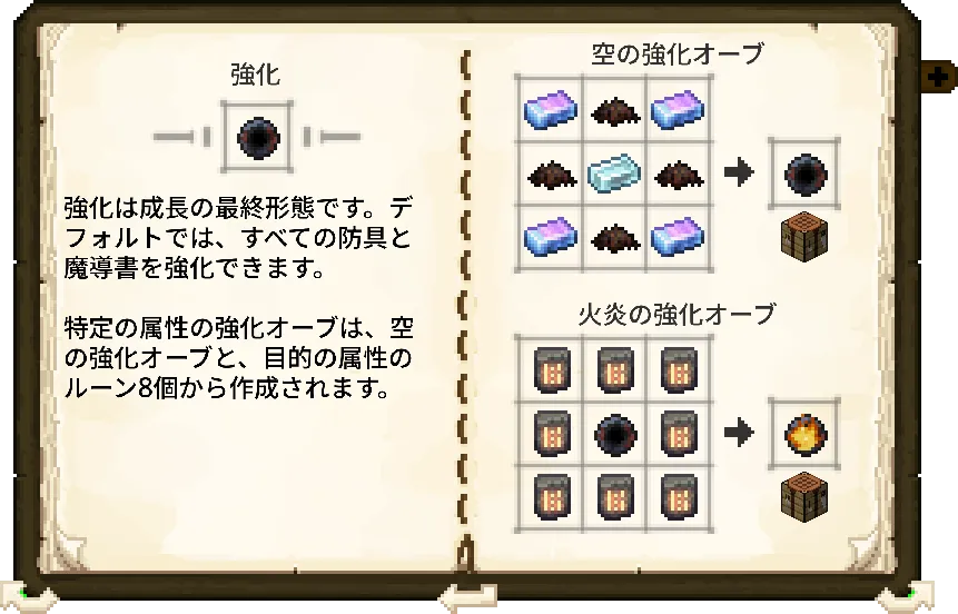 | アップグレード | 強化オーブを使用し、防具や魔導書の属性(魔法威力、クールダウン短縮など)を永続的に強化できる。 |