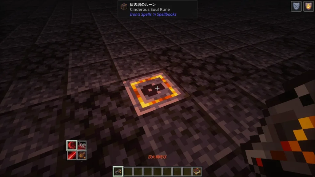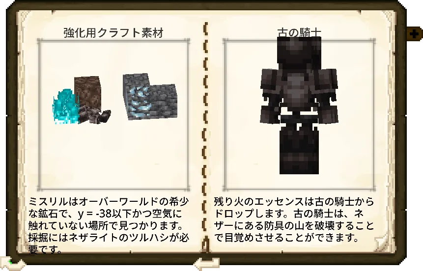 y=-38以下かつ空気に触れていない場所に生成される希少鉱石です。採掘にはネザライトのツルハシが必須となります。 - 残り火のエッセンス:ネザーの「防具の山」を破壊して目覚める古の騎士がドロップします。