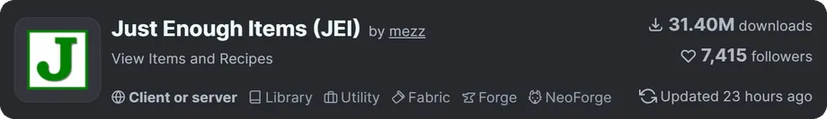- 開発者フレンドリー: 独自のAPIを備えており、他のMOD制作者が自分のMODのレシピをJEIに統合しやすくなっています。