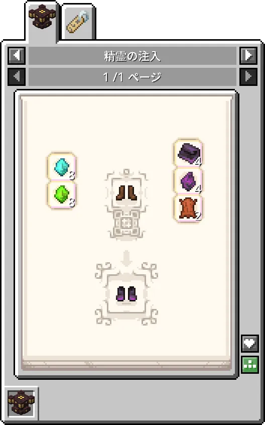 - そのままクラフト材料にするほか、「精霊の注入」によって他の素材と融合させます。