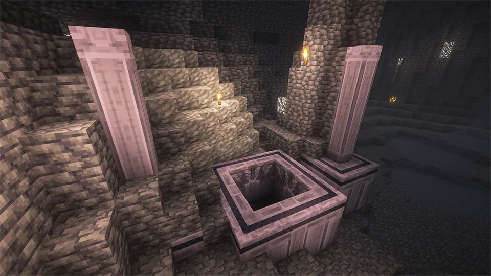 さらに深淵を覗きたいなら、地下に生成される構造物「嘆きの井戸」を探しましょう。 ここに特定のアイテム(鉄ブロックなど)を投げ入れることで、現実離れした「異形の設計図」や、さらに高度な「影の精霊」に関連する素材へと変換されます。