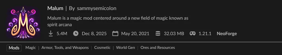 魂から派生する超常的なエネルギーである「スピリット・アルカナ」を中心としたダークマジックMOD『Malum』 の解説と日本語化リソースパックを配布しています。