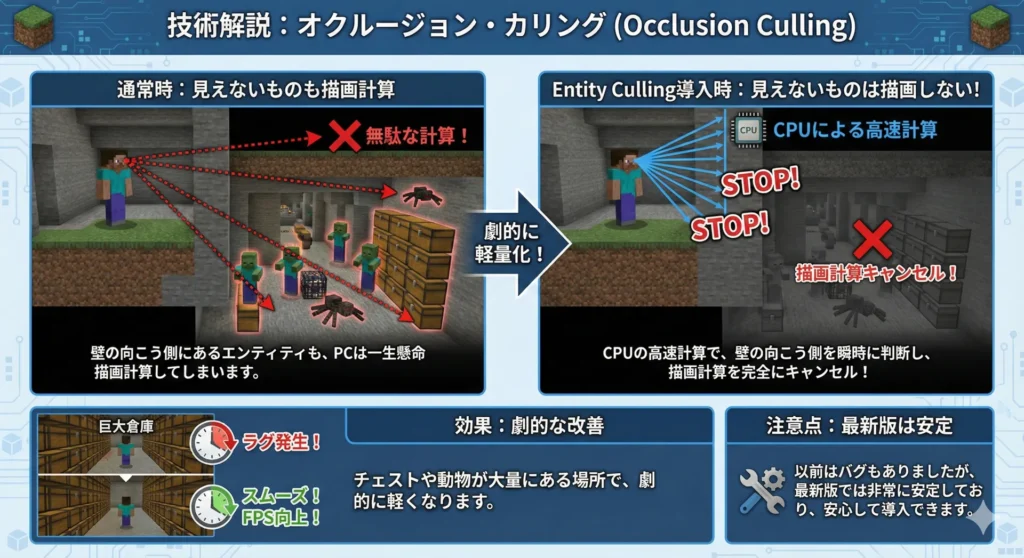 プレイヤーの目から見えない「壁の向こう側」にあるエンティティ(モンスターやチェスト)を瞬時に判断し、それらの描画計算を完全にキャンセルします。