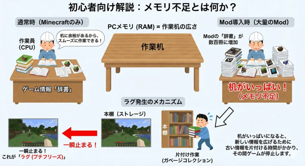 Modを入れると、この辞書の数が数百冊に増え、机の上(メモリ)がいっぱいになってしまいます。