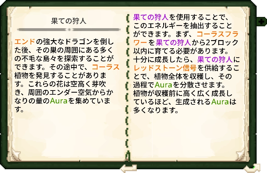 - 果ての狩人にレッドストーン信号を供給することで、植物全体を収穫し、その過程でAuraを拡散します。