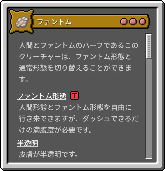 | ファントム☠️ | 壁を通り抜け、姿を透明にすることができます。 | 日光で燃えてしまい、特殊能力の使用中は空腹が激しく進行します。 | 大 |