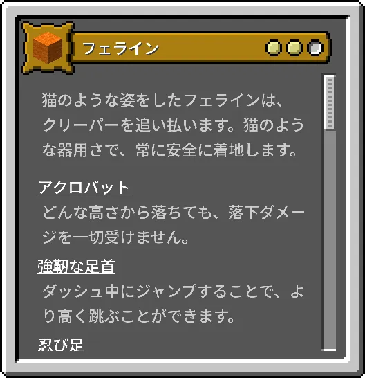 | フェライン | 落下ダメージを無効化し、クリーパーを遠ざけます。夜間も視界が効きます。 | 体力がハート1つ分少なく、力のポーションなしでは天然石の採掘が制限されます。 | 中 |