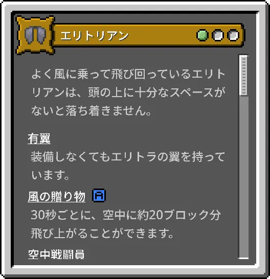 | エリトリアン | 最初からエリトラを持っており、30秒ごとに空へ飛び上がることができます。 | 天井が低い場所では弱体化し、重い防具を装備できません。 | 小 |
