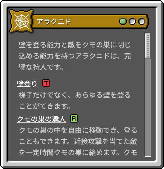 | アラクニド | あらゆる壁を登ることができ、攻撃した敵をクモの巣に絡めます。 | 体力がハート3つ分少なく、食事は肉類に限定されます。 | 小 |