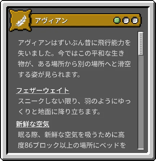 | アヴィアン🔰 | 常にゆっくり降下し、移動速度がわずかに上昇します。また、起床時に卵を産みます。 | 高度86ブロック以上でしか眠れず、肉類を食べることができません。 | 小 |