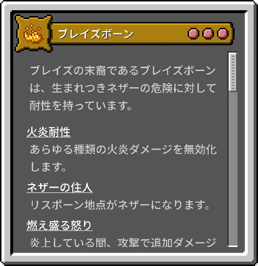| ブレイズボーン☠️ | 火炎ダメージを完全に無効化し、炎上中は攻撃力が上がります。毒や空腹も無効です。 | 水や雪玉でダメージを受け、初期スポーン地点がネザーになります。 | 大 |