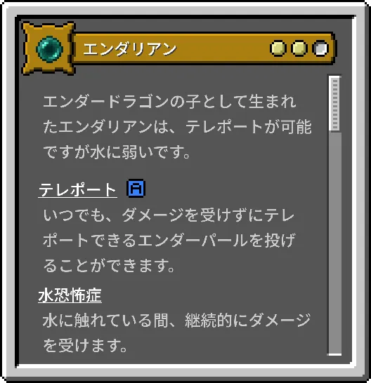 | エンダリアン | ダメージを受けずにエンダーパールを投げて瞬間移動でき、手が届く距離も長いです。 | 水に触れるとダメージを受け、カボチャを被ったものを見ると怯えます。 | 中 |