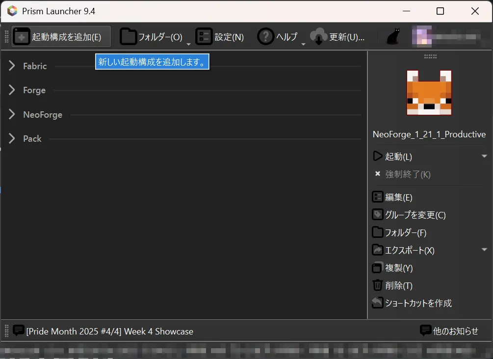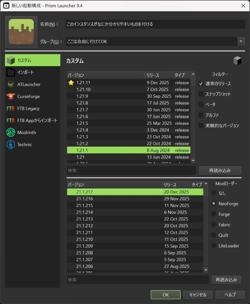 Prism Launcherを開き、「起動構成を追加」から、遊びたいマイクラのバージョンMODローダー(FabricやForgeなど)を選択してインスタンスを作成します。