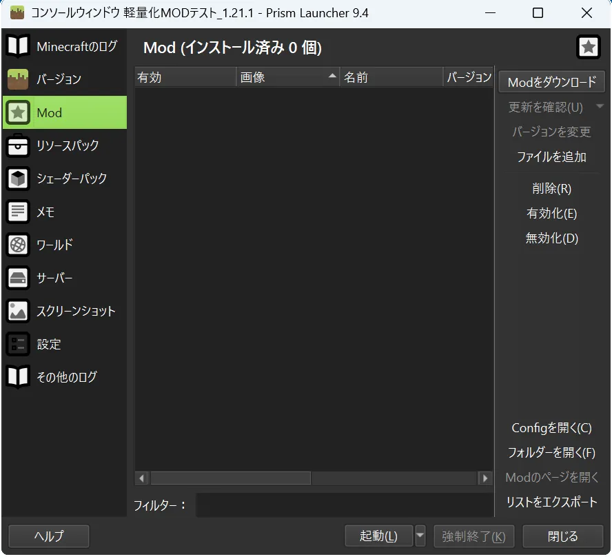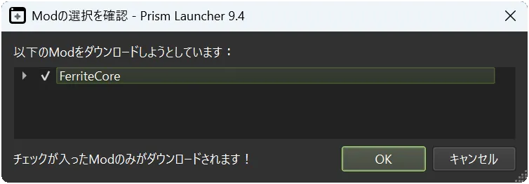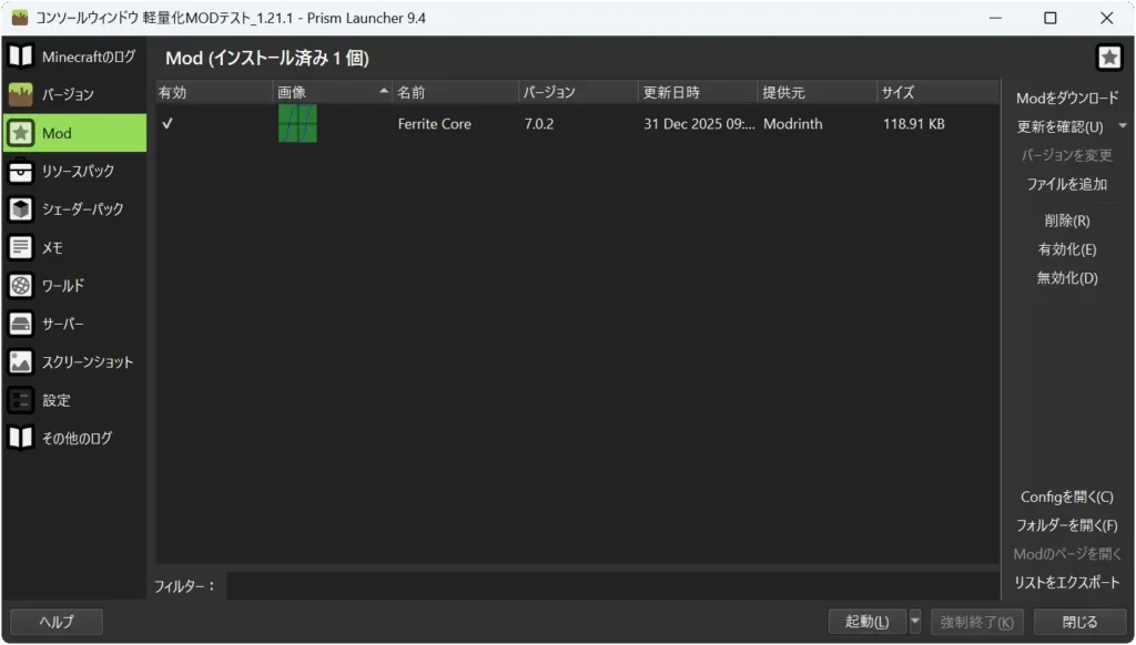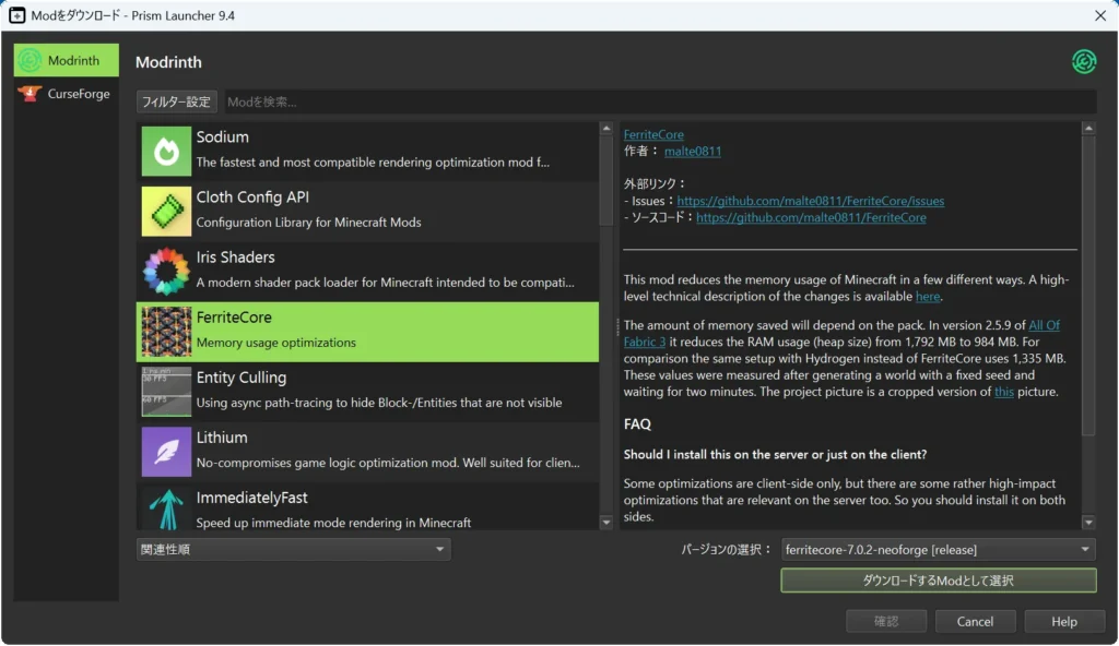 • これだけで、必要なバージョンで前提MOD(FabricやForgeなど)も一緒に整えてくれる優れものです。
