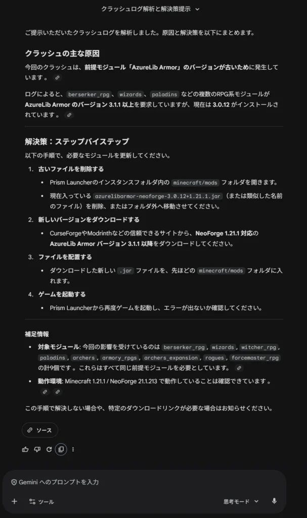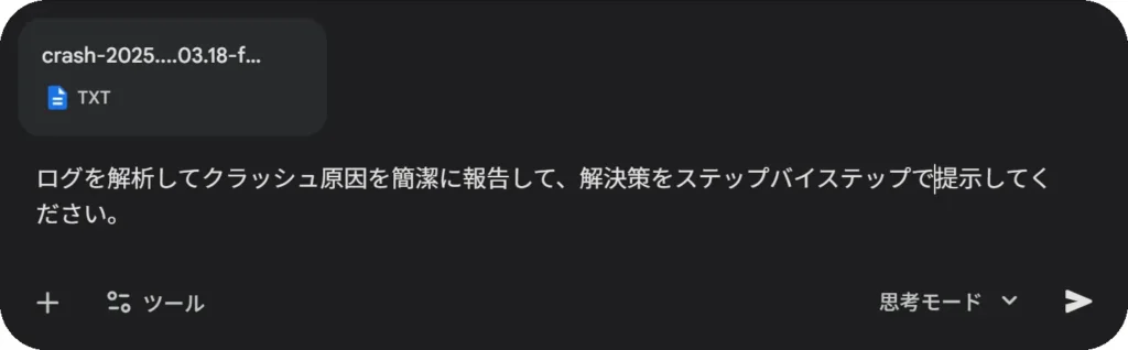 ChatGPTGeminiなどの生成AIに、以下のような指示とクラッシュレポートを追加する。