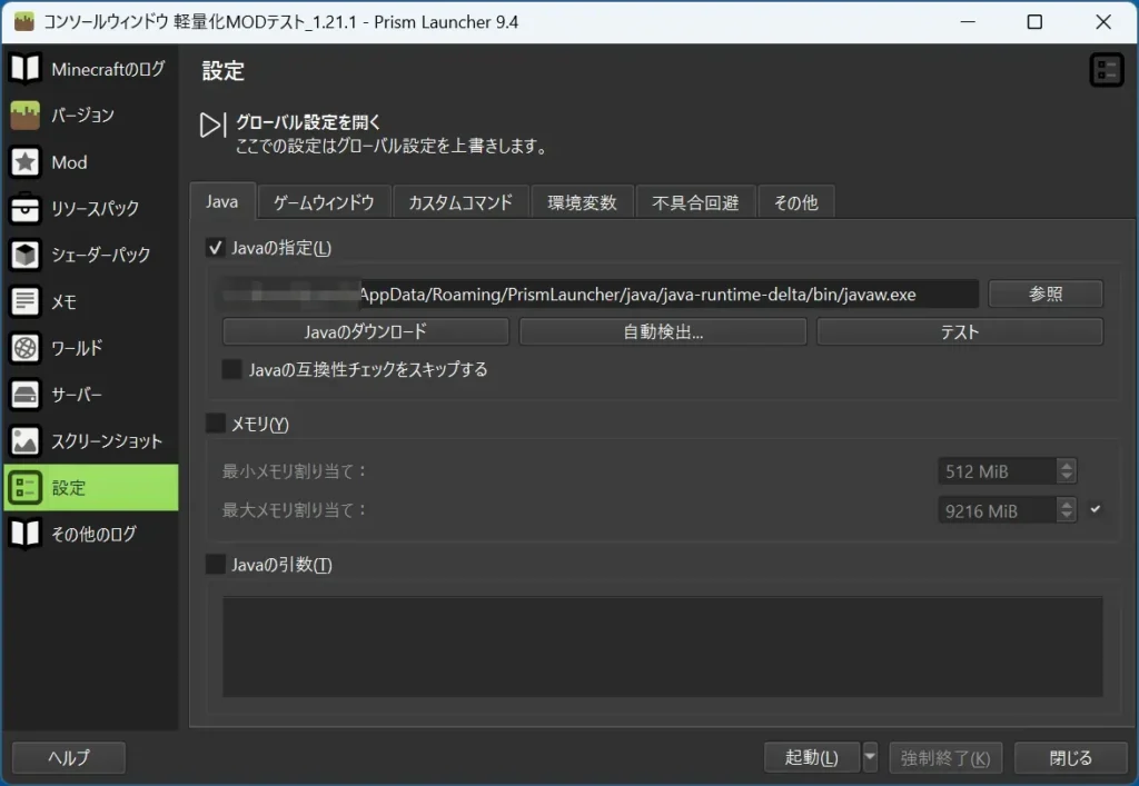マイクラのバージョンによって必要なJavaが異なりますが、Prism Launcherは「どのJavaを使えばいいか」を自動で検知してくれます。エラーが出た時は、設定画面の「Java」から「自動検出」ボタンを押すだけで解決することがほとんどです。