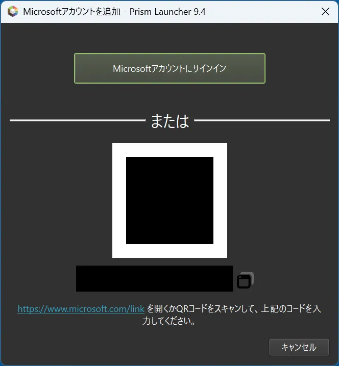 Microsoftアカウントにサインイン」ボタンをクリックするか、QRコードをスキャンして、記載のコードを入力すると完了です。
