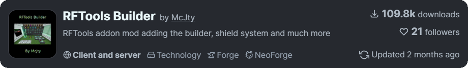 RFTools Builderは、RFTools BaseのアドオンMODで、ビルダーブロックと各種シェイプカード、そしてシールドシステムを追加します。