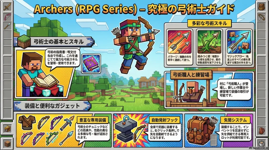 「Archers (RPG Series)」は、マインクラフトにRPGスタイルの「弓術士」クラスを導入し、遠距離攻撃のメカニクスを拡張するMODです。