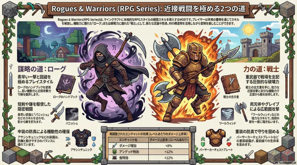 このMODは、マインクラフトにRPGのようなクラス(職業)システムを導入し、戦闘スタイルを根本から変える要素を追加します。World of Warcraftにインスパイアされた「ローグ」と「戦士」という2つの対照的なプレイスタイルにより、戦略的な戦闘が可能になります。